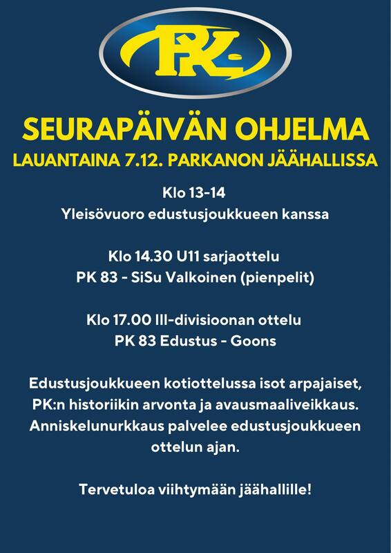Pelien lisäksi jäähallilla on paljon oheistapahtumaa. Lauantaina vietetään seurapäivää Parkanon jäähallilla, joka alkaa kaikille avoimella yleisövuorolla edustusjoukkueen pelaajien kanssa. Sarjaottelunsa päivän aikana pelaavat U11 ja edustusjoukkue. Edustusjoukkueen ottelussa on luvassa isot arpajaiset ja avausmaaliveikkaus, jossa palkintona on K-Supermarket Parkanon lahjoittama joulukinkku. Lisäksi arvotaan Parkanon Kiekon 40-vuotishistoriikki. Edustusjoukkueen sisääntulossa ovat mukana seuran U8 ja U10-juniorit, jotka pääsevät saattamaan pelaajat jäälle. Ennen ottelun alkua jäällä on luvassa palkitsemisia. Ensimmäisellä erätauolla nähdään Uplakersin taitoluistelijoiden taitoiluisteluesityksiä. Tervetuloa mukaan viettämään yhteisöllistä päivää! |